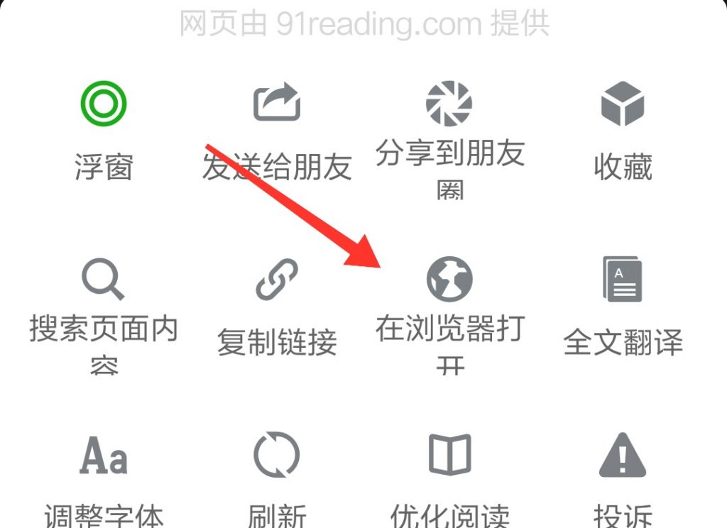 进入APP下载页面,点击【下载 91READING APA】橙色按钮。这个时候微信会提示【点击...按钮】,【选择在浏览器打开】。